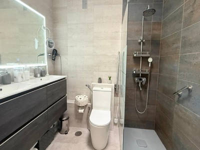 En la planta superior se ubican tres acogedores dormitorios y un cuarto de baño amplio, completamente renovado, que destaca por su diseño y acabados de alta calidad. Dispone de un plato de ducha de obra con cabezal tipo lluvia, control automático de temperatura y un espejo de gran tamaño con iluminación y sistema de sonido integrado, creando un espacio cómodo, moderno y funcional.